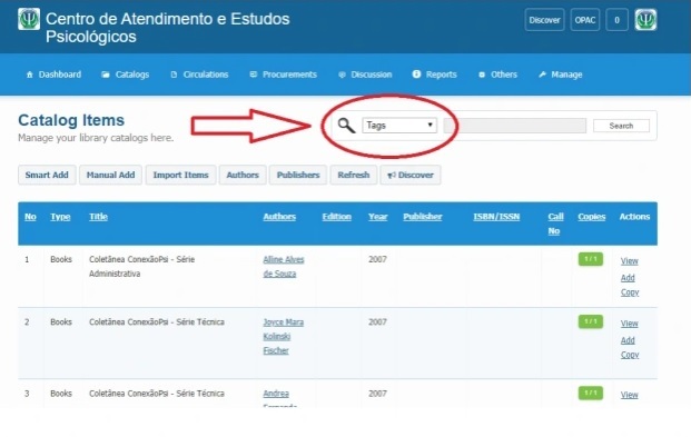 Para pesquisar um livro a partir de alguma palavra chave mude o critério de pesquisa de default para tags, como na imagem abaixo: