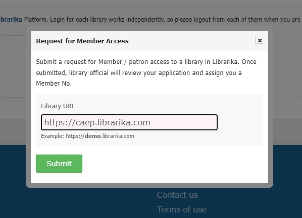 Na caixinha que aparecer, escreva https://caep.librarika.com. Clique no botão submit.